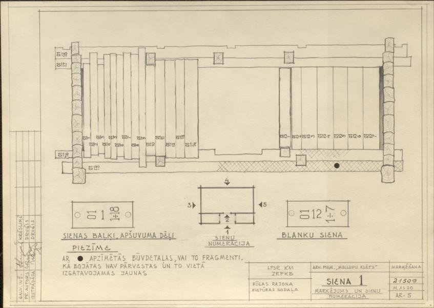 Doles muižas apbūve. Mellupu klēts, marķējums un sienu numerācija (Salaspils novads, Salaspils pagasts. Daugavas muzejs.)