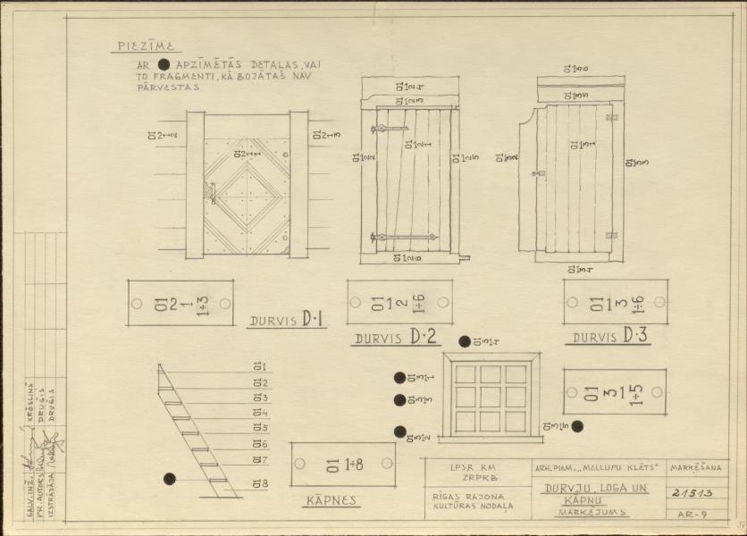Doles muižas apbūve. Mellupu klēts, durvju, loga un kāpņu marķējums (Salaspils novads, Salaspils pagasts. Daugavas muzejs.)