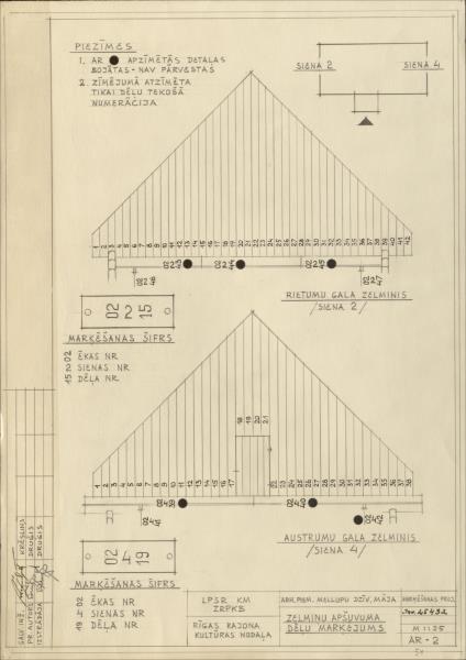 Doles muižas apbūve. Mellupu dzīvojamā māja, zelmiņu apšuvuma dēļu marķējums (Salaspils novads, Salaspils pagasts. Daugavas muzejs.)