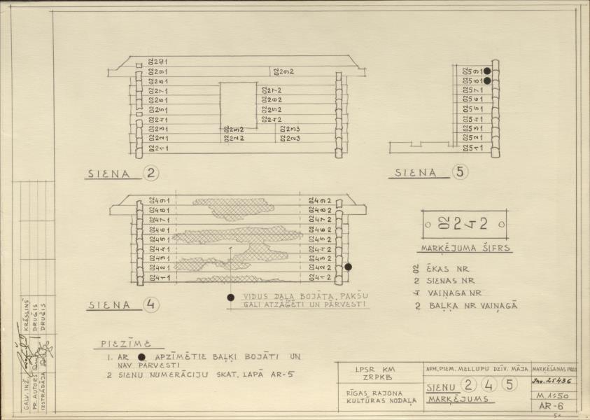 Doles muižas apbūve. Mellupu dzīvojamā māja, sienu marķējums (Salaspils novads, Salaspils pagasts. Daugavas muzejs.)