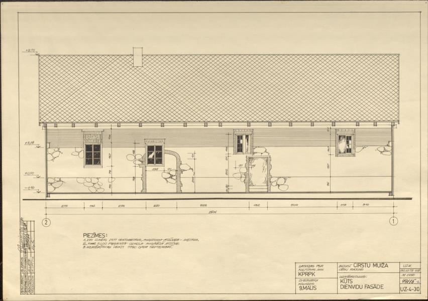 Cirstu muižas apbūve. Kūts. Dienvidu fasāde (Vecpiebalgas novads, Inešu pagasts. Cirstu pils.)