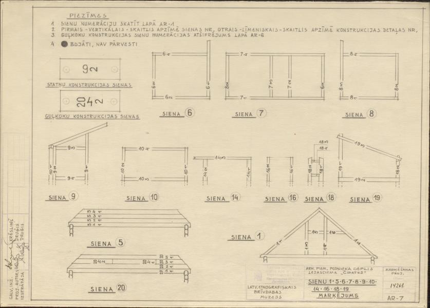 Latvijas etnogrāfiskais brīvdabas muzejs celtņu komplekss. Podnieka ceplis Lejasciema Čipatos, Sienu 1-5-6-7-8-9-10-14-16-18-19 marķējums ( Rīga. Bonaventuras iela 10.)