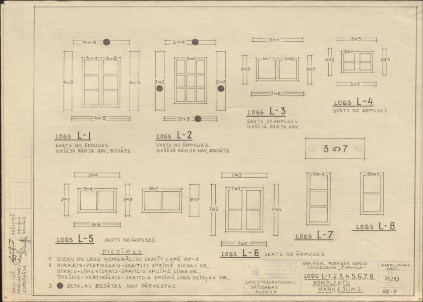 Latvijas etnogrāfiskais brīvdabas muzejs celtņu komplekss. Podnieka ceplis Lejasciema Čipatos, Logu L-1, 2, 3, 4, 5, 6, 7, 8 komplektu marķējums ( Rīga. Bonaventuras iela 10.)