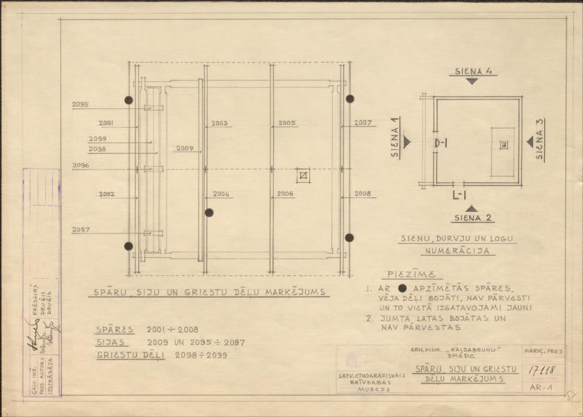 Latvijas etnogrāfiskais brīvdabas muzejs celtņu komplekss. Kaldabruņas smēde. Spāru, siju un griestu dēļu marķējums, sienu, durvju un logu numerācija ( Rīga. Bonaventuras iela 10.)