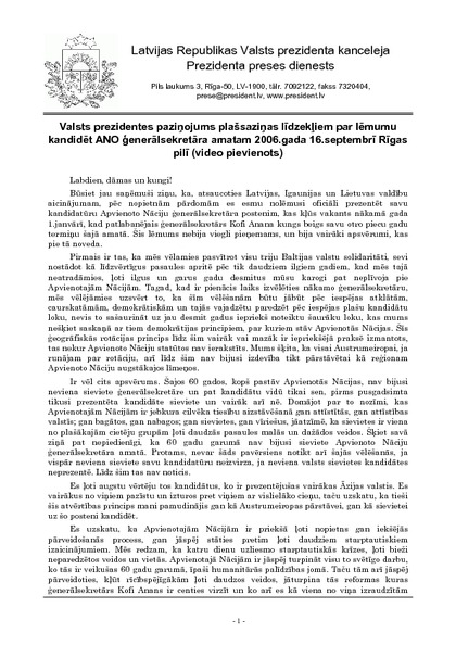 Valsts prezidentes paziņojums plašsaziņas līdzekļiem par lēmumu kandidēt ANO ģenerālsekretāra amatam 2006.gada 16.septembrī Rīgas pilī (video pievienots)