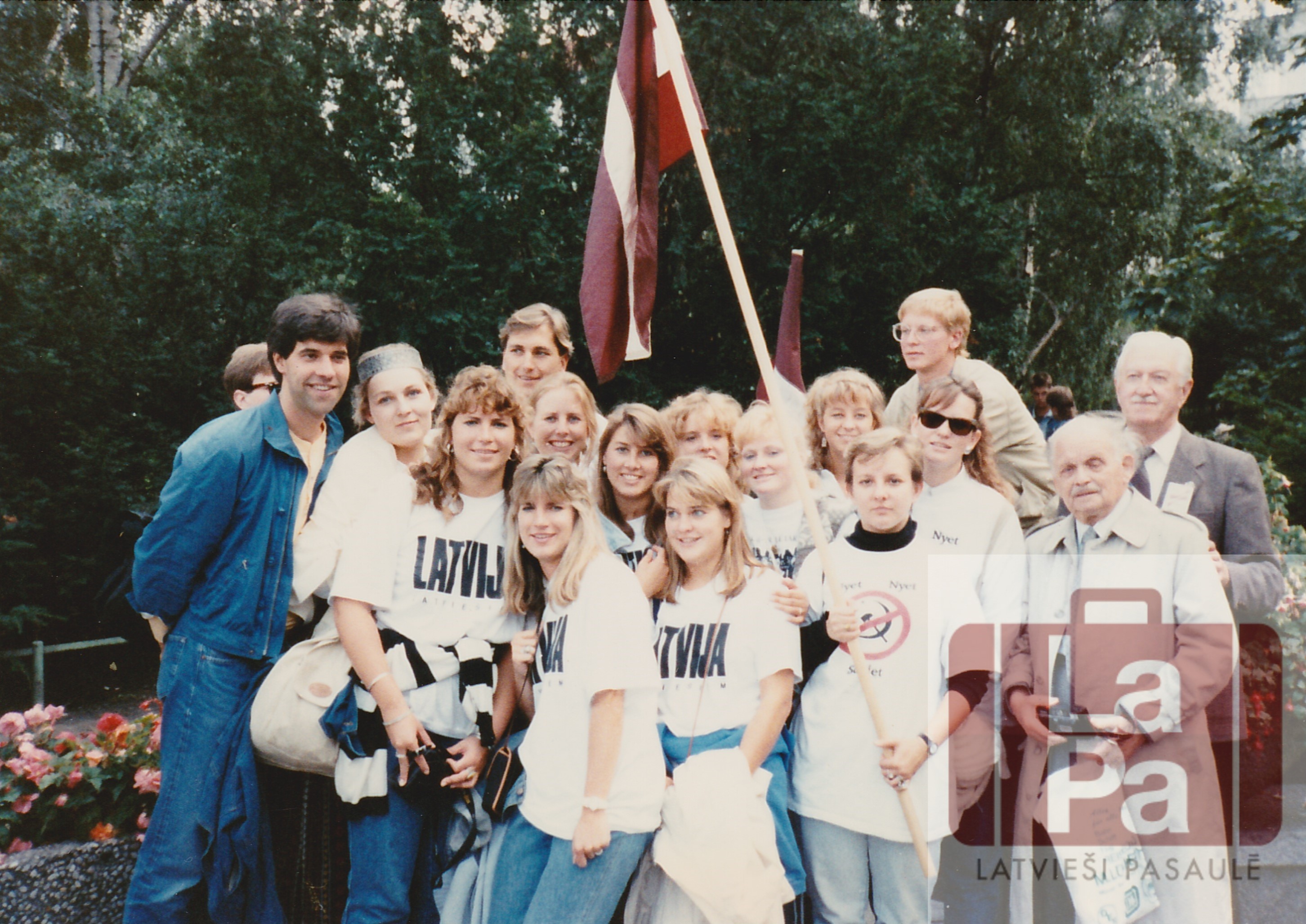 Daži gājiena dalībnieki nacionālpolitiskajā manifestācijā, kas tika rīkota Berlīnē pēc Pasaules brīvo latviešu Dziesmu dienām un kultūras svētkiem Minsterē. Speciālvilciens transportēja dziesmu svētku dalībniekus uz Berlīni. Fotogrāfijā redzami: Raimonds Slaidiņš, Ingrīda Balode, Anita Millere, Tamāra (Millere) Rūse, Vita Slaidiņa, Anita (Jēgere?) Carlyle, Marissa Slaidiņa, Astrīda Slaidiņa, Intra (Krūmiņa) Ģērmane, Vanda Dauksta, Kaija Gertnere Ozola, Pēteris Albertiņš, Viktors Upeslācis, Arvīds Bolšteins.
