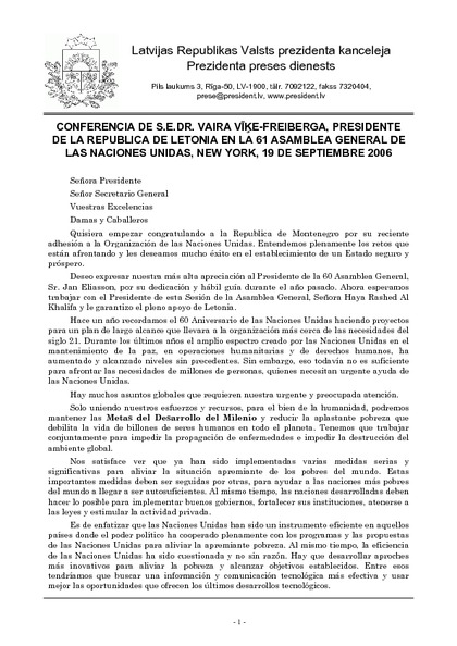 CONFERENCIA DE S.E.DR. VAIRA VĪĶE-FREIBERGA, PRESIDENTE DE LA REPUBLICA DE LETONIA EN LA 61 ASAMBLEA GENERAL DE LAS NACIONES UNIDAS, NEW YORK, 19 DE SEPTIEMBRE 2006