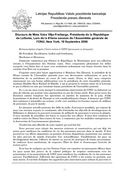 Discours de Mme Vaira Vīķe-Freiberga, Présidente de la République de Lettonie, Lors de la 61ème session de l’Assemblée générale de l’ONU, New York, 19 Septembre 2006