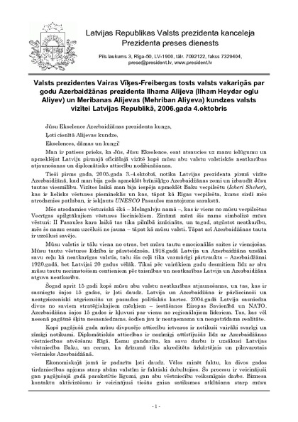 Valsts prezidentes Vairas Vīķes-Freibergas tosts valsts vakariņās par godu Azerbaidžānas prezidenta Ilhama Alijeva (Ilham Heydar oglu Aliyev) un Meribanas Alijevas (Mehriban Aliyeva) kundzes valsts vizītei Latvijas Republikā, 2006.gada 4.oktobris