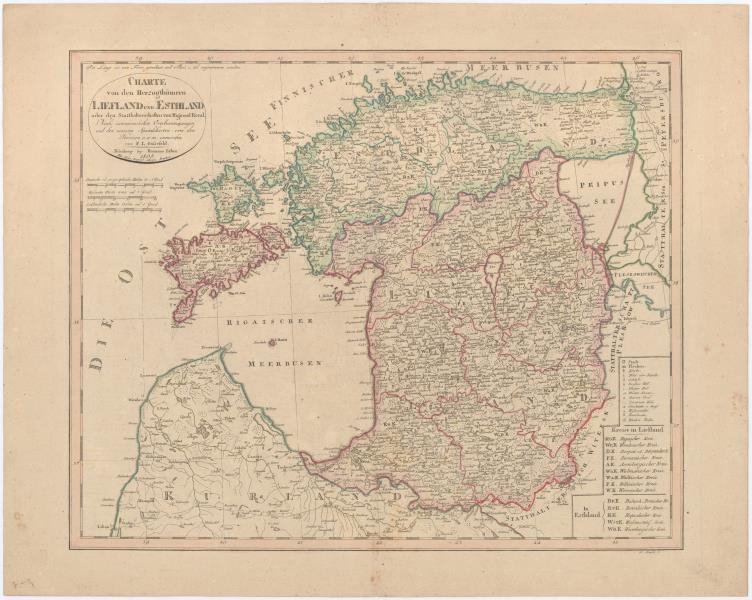 Charte von den Herzogthümern Liefland und Esthland oder den Statthalterschaften von Riga und Reval. Nach astronomischen Ortsbestimmungen und den neuesten Specialcharten von den Kreisen u.a.m.