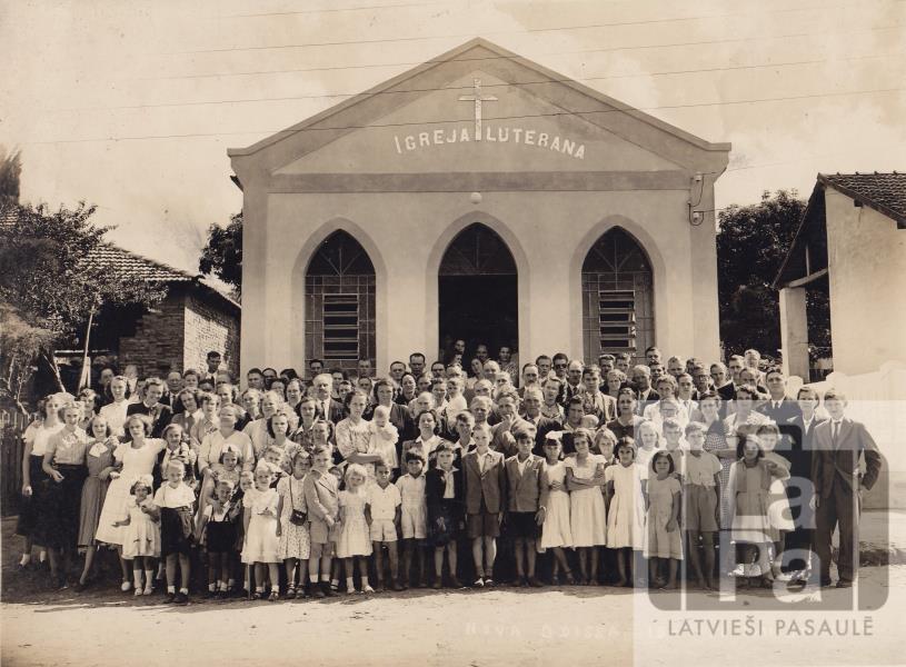 Novaodesas luterāņi pie pirmās baznīcas Rio Branko ielā (Rua Rio Branco) iesvētīšanas dienā 1951. gada 15. aprīlī. Aizmugurē starp baznīcu un mūra ēku stāv Jānis Rutulis.