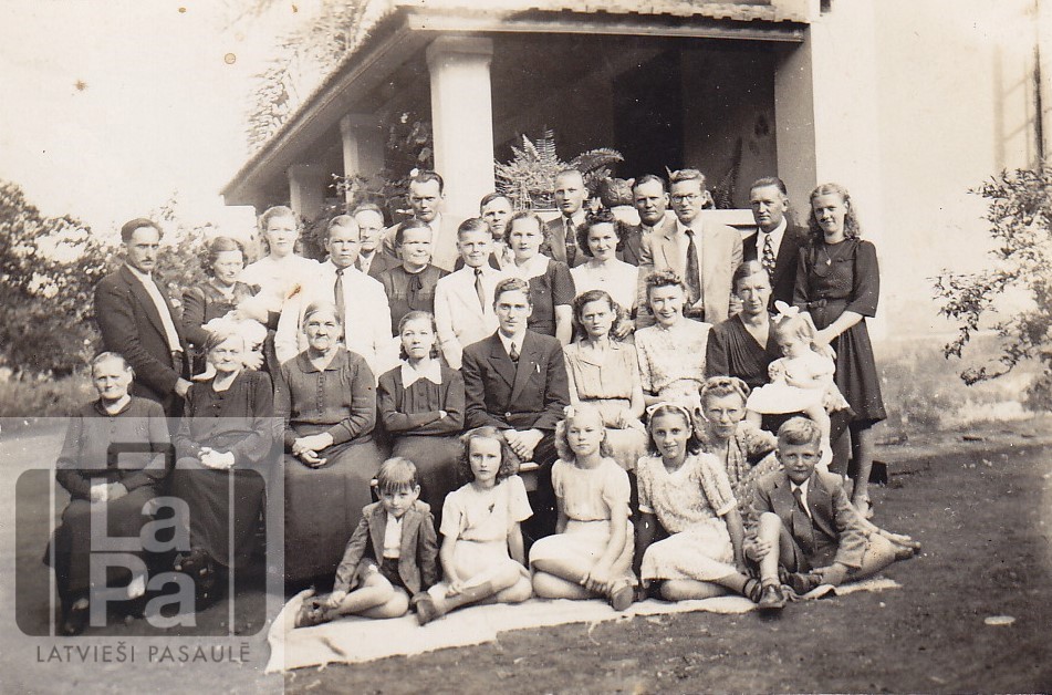 Novaodesas luterāņi Mežgrāvju mājās. Pirmās rindas vidū sēž vācu luterāņu mācītājs Ernesto Augusto Heine. Otrā pusē teksts mācītāja Jēkaba Mekša rokrakstā: "Dievkalpojuma dalībnieki "Mežgrāvjos" mājās 1945. g. vidū māc. Heine”.