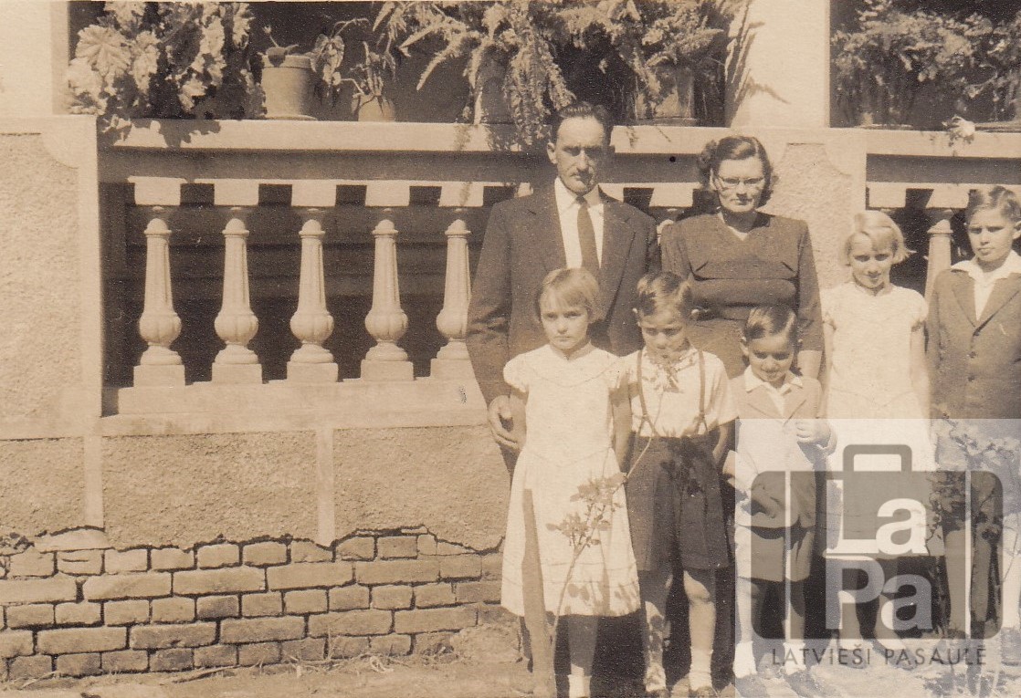 Kārlis un Olga Mežgrāvji un viņu pieci bērni Novaodesā pie Mežgrāvju mājas. 1954. gads.