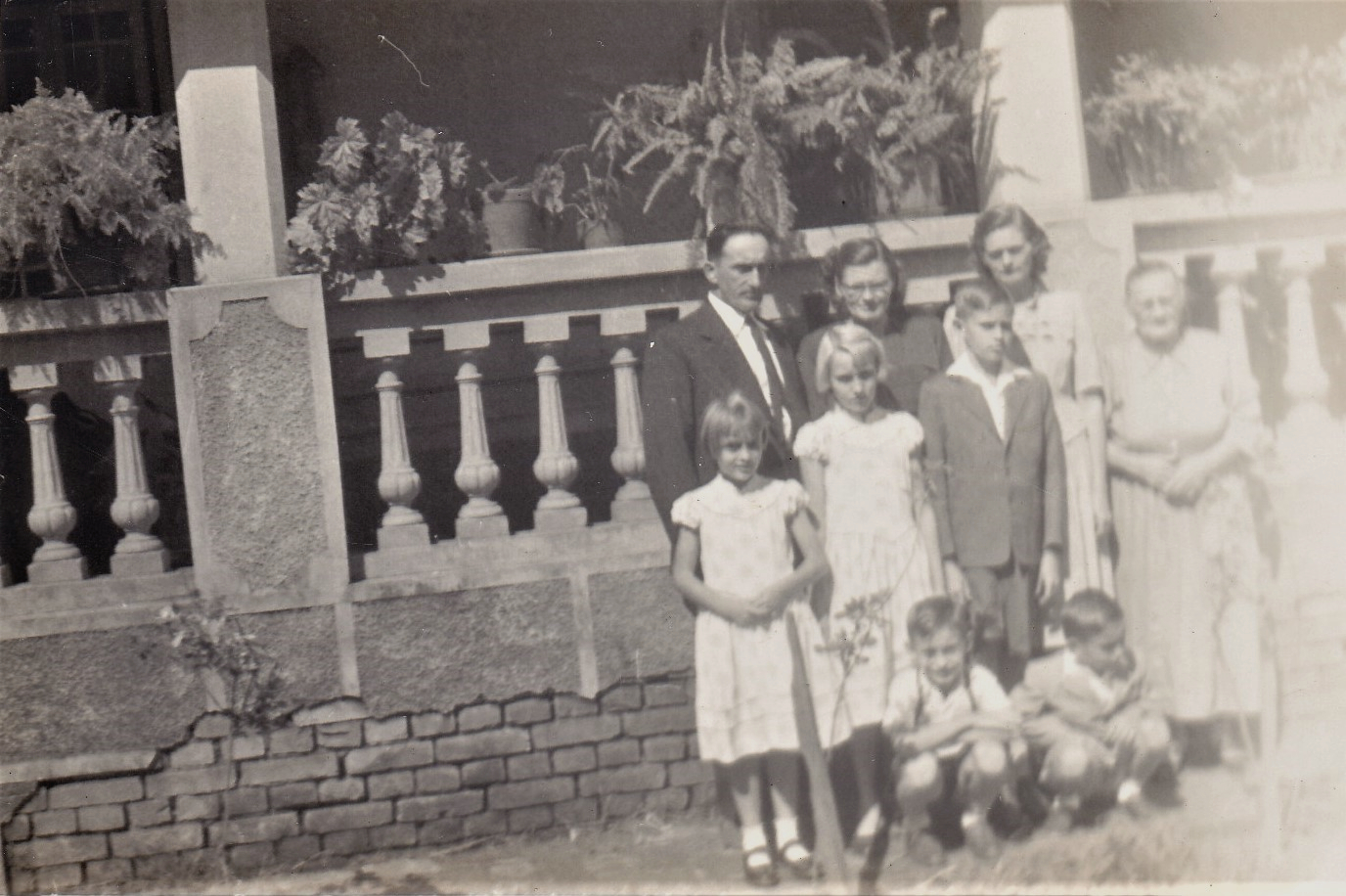 Kārlis un Olga Mežgrāvji ar pieciem bērniem un divām nezināmām sievietēm Novaodesā pie Mežgrāvju mājas. 1954. gads. Otrā pusē mācītāja Jēkaba Mekša rokrakstā: Familia Mešgrāvis.