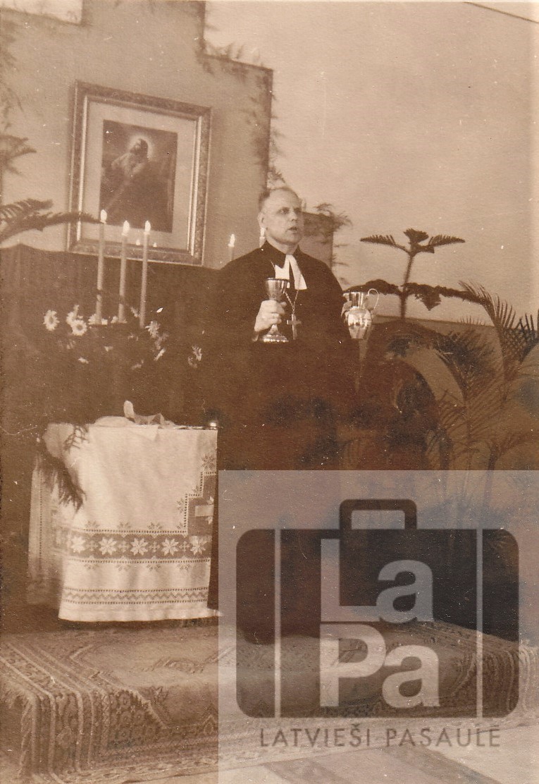 Altāra trauku iesvēte Novaodesas luterāņu baznīcā 1954. gada 31. oktobrī. Luterāņu mācītājs Jēkabs Mekšs. Otrā pusē mācītāja J. Mekša rokrakstā: Iesvētot altāra traukus 31X 54 Nova Odessā (pārsvītrots: S. Paulo).