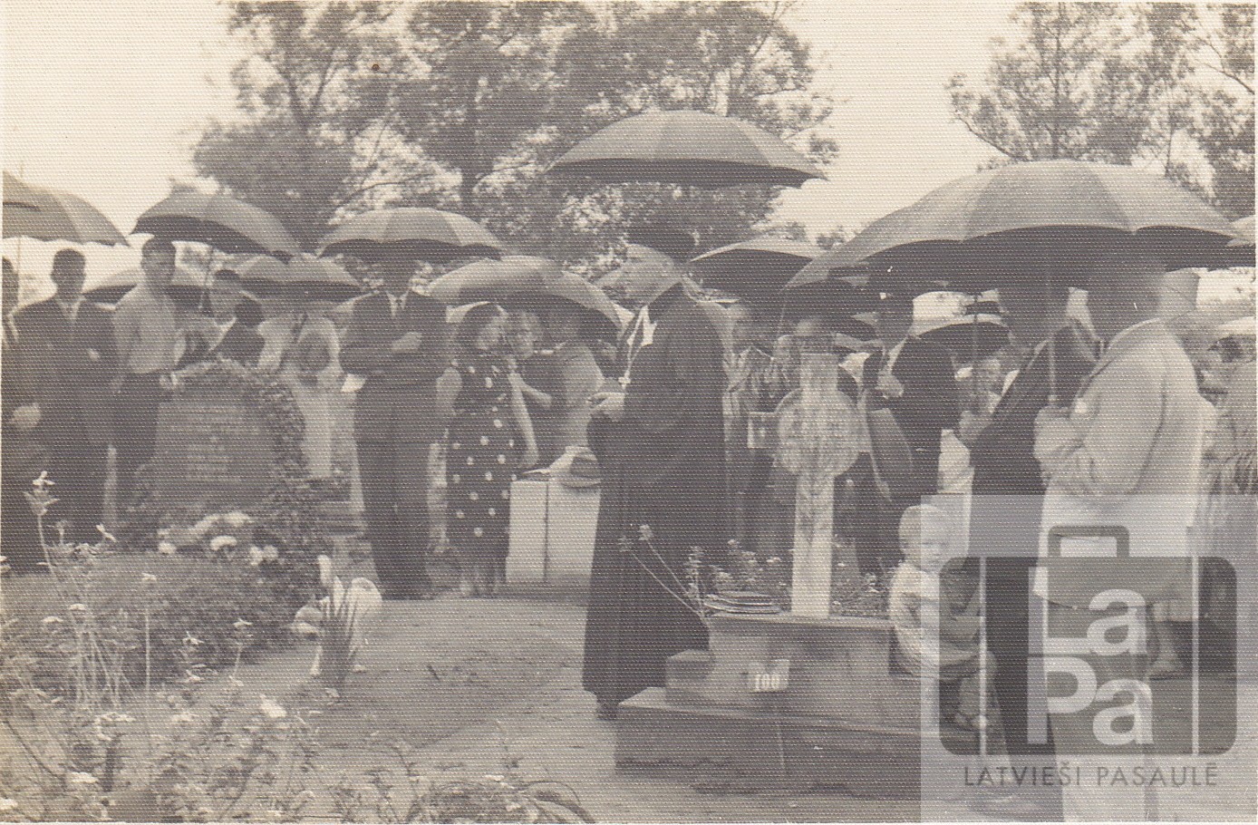 Pirmie latviešu luterāņu kapusvētki Novaodesā 1953. gada 2. novembrī. Centrā luterāņu mācītājs Jēkabs Mekšs. Otrā pusē fotogrāfa zīmogs: VICTOR REIS Rua Rio Branco N.213 NOVA ODESSA Est. Sao Paulo
