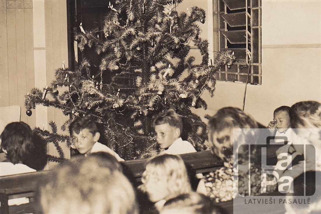 Bērni pie Ziemassvētku eglītes Novaodesas (Brazīlija) luterāņu baznīcā 20. gadsimta 60. gados. Otrā pusē mācītāja Jēkaba Mekša rokrakstā: Nova Odessā 1969.