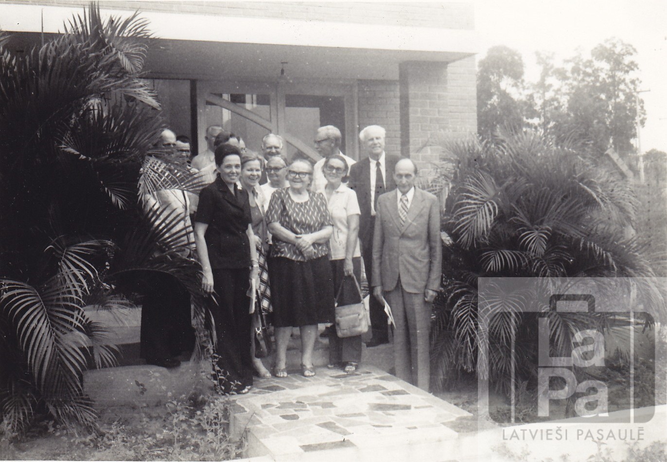 Latviešu grupa pie Novaodesas luterāņu dievnama 1977. gadā. Iespējams, Latviešu kultūras centra Brazīlijā sanāksmes laikā. Priekšplānā no kreisās: Zigrīda Gintere, Adīne Kūdriņš Reiss, Emma Lezdkalne, baptistu mācītājs Andrejs Ceruks. Aizmugurē no kreisās: Pēteris Balaņuks, Oto Lezdkalns, luterāņu mācītājs Jēkabs Mekšs.