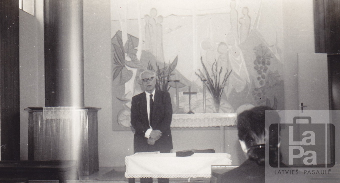 Luterāņu mācītājs Jēkabs Mekšs Latviešu kultūras centra Brazīlijā sanāksmē Novaodesas luterāņu baznīcā. 1977. gads.