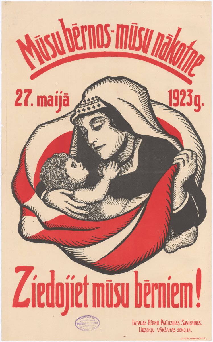 Mūsu bērnos - mūsu nākotne. Ziedojiet mūsu bērniem 27. maijā 1923. g. [attēls] Latvijas Bērnu palīdzības savienības līdzekļu vākšanas sekcija / mākslinieks nezināms