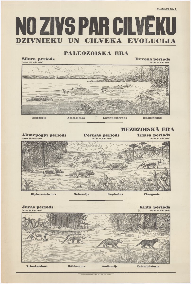 No zivs par cilvēku. Dzīvnieku un cilvēka evolūcija. Plakāts Nr. 1 [attēls] Paleozoiskā ēra. Mezozoiskā ēra / mākslinieks nezināms