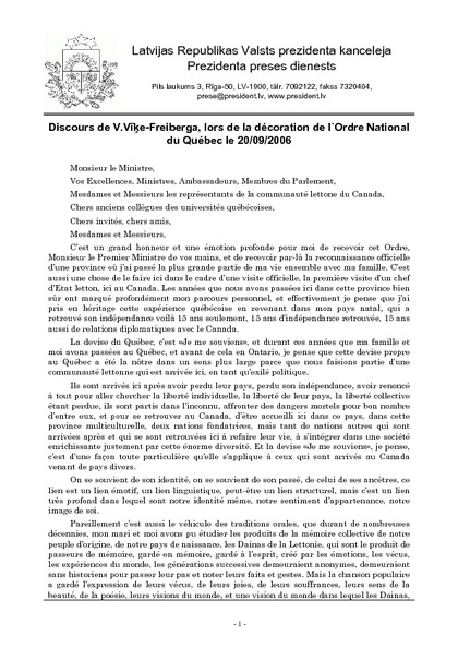 Discours de V.Vīķe-Freiberga, lors de la décoration de l`Ordre National du Québec le 20/09/2006