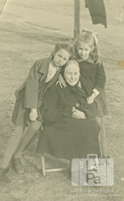 Mācītāja Pētera Nesaules meitas kopā ar vecmāmiņu. No kreisās: Beāte Nesaule, Līna Kness-Kņezinskis un Agate Nesaule Rotenburgas nometnē (angļu zonā).
