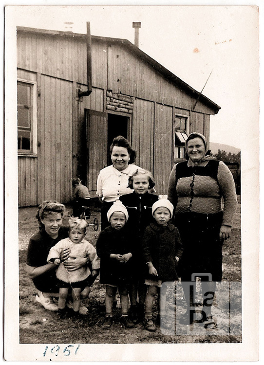 Sievietes un bērni stāv koka barakas "Monte casino" galā Augustdorfas nometnē (angļu zonā). Otrā rindā Aija Ebdene (dz. Lasmane), viņai aiz muguras Elza Lasmane un Milda (?) Tamanis.