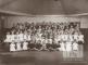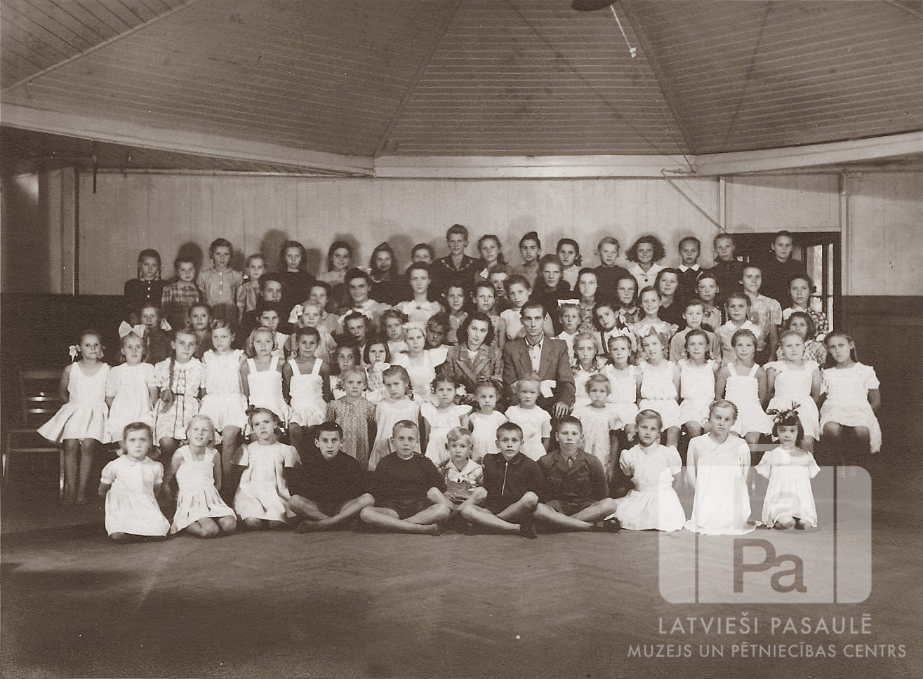 Baleta klase Saules nometnē Gēsthahtā (angļu zonā). Meitene trešās rindas vidū (skolotājai pa kreisi) ir Aija Meistere.