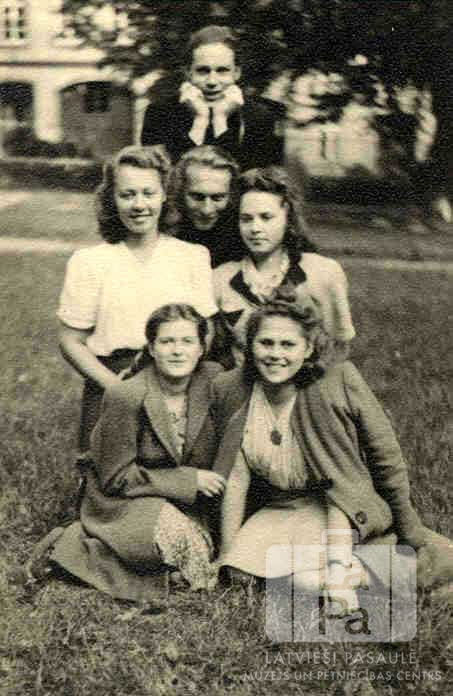 Ģimnāzijas 4. klases jaunieši Blombergas nometnē (angļu zonā). Priekšā, no kreisās: Ieva Prīmane un Rasma Celma. Otrā rindā, no kreisās: Aina Tauriņa (pr. Caune), Jānis Ērglis un Regīna Vasere. Aizmugurē Daumants Tomsons.