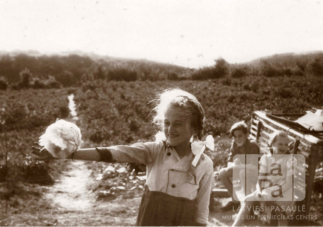 Bērni ar vistu iekopta dārza malā Špakenbergas nometnē Gēsthahtā (angļu zonā). Meitene ar vistu uz rokas: Aija Meistere.