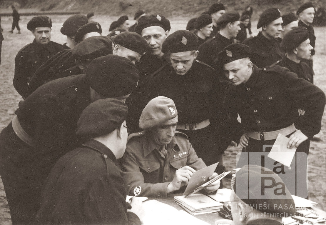 Angļu armijas "Melno vienība" Fliegerhorstā (angļu zonā). Virsnieks ar zaldātiem. Piektais no kreisās puses (vidū) Arturs Meisters; kreisā pusē aizmugurē Kārlis Valentīns.
