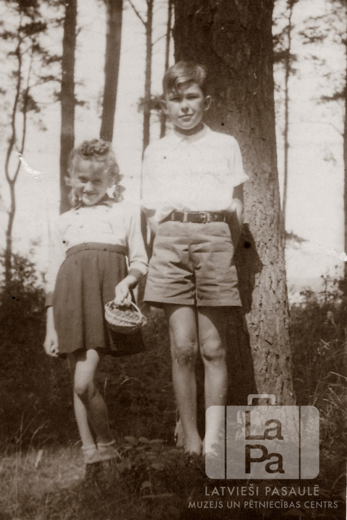 Divi bērni ar groziņu, sēņojot mežā 1949. gada rudenī. No kreisās: Aija Meistere un brālis Juris Meisters.