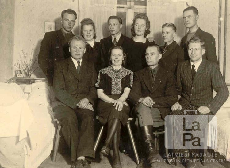 Latviešu grupas bilde Lieldienās Rozālijas (Rosalien) kazarmu istabā Braunšveigas nometnē (angļu zonā). Pirmajā rindā, no kreisās: Ēriks Priedītis, Lilija Tauriņa, Eduards Tauriņš un Egīls Gīlis. Aizmugurē, no kreisās: Harijs Zvīgulis, Austra Tauriņa, Pāvils Ķirītis, Aina Tauriņa (pr. Caune), Arvīds Treimanis un Mārtiņš Ozoliņš.