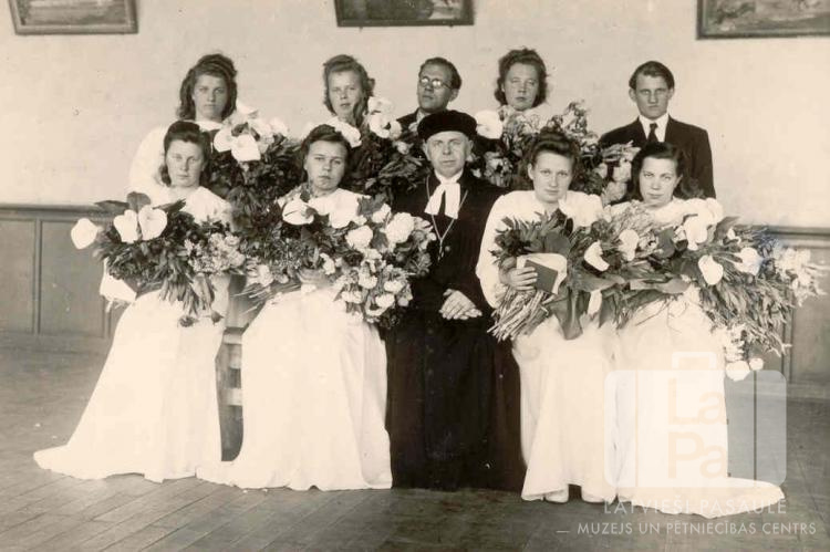 Pirmās iesvētības Braunšveigas nometnē (angļu zonā) 1946.–1947. gada 25. maijā. Aizmugurē, no kreisās: otrā Austra Tauriņa, ceturtā Aina Tauriņa (pr. Caune).