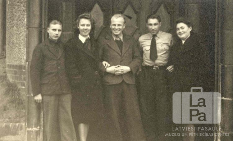 Bērnības draugu atkalsatikšanās Braunšveigas nometnē (angļu zonā). No kreisās: Arvīds Treimanis, Aina Tauriņa (pr. Caune), Ēriks Priedītis, Pāvils Ķirītis un Līvija Kica.