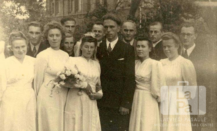 Kāzinieki – jaunais pāris, brūtes māsas un brūtganbrāļi – Strautas Mālderes un Harija Zvīguļa kāzu dienā Braunšveigas nometnē (angļu zonā). Priekšējā rindā, no kreisās: Aina Ose, Aina Tauriņa (pr. Caune), jaunais pāris Strauta Māldere un Harijs Zvīgulis, Anna Māldere un Austra Tauriņa.
