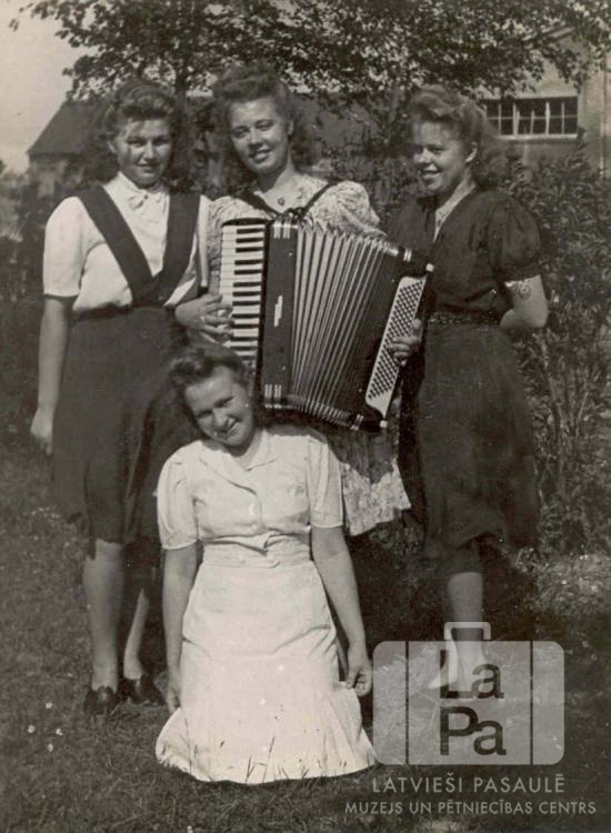 Četras jaunietes Braunšveigas nometnē (angļu zonā). Stāv, no kreisās: Penija Nikonova, Aina Tauriņa (pr. Caune) un Austra Tauriņa.