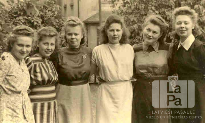 Sešas ģimnāzistes Blomberga nometnē (angļu zonā). No kreisās: Aina Ose, Zigrīda Kuncīte, Austra Tauriņa, Biruta Poga, Rasma Kica un Aina Tauriņa (pr. Caune). Par šo gadījumu Aina Caune (dz. Tauriņa) atceras: "Blombergas DP nometnē apvienoja ģimnāziju, kur arī mēs no Braunšveigas DP nometnes turpinājām savu izglītību."
