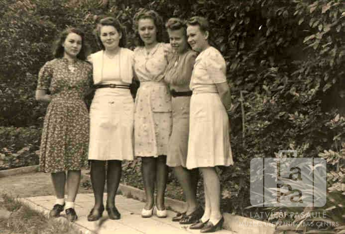 Piecas ģimnāzistes Blombergas nometnē (angļu zonā). No kreisās: Zigrīda Plūmane, Līvija Kica, Aina Tauriņa (pr. Caune), Austra Tauriņa un Aina Ose.