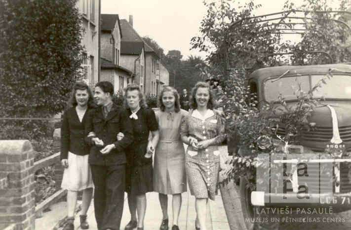 Pieci ģimnāzisti pastaigas laikā Blombergas nometnē (angļu zonā). Jauniešiem blakus uz ielas ar koku zariem izdekorēta smagā automašīna. Par šo gadījumu Aina Caune (dz. Tauriņa) atceras: "Blombergas DP nometnē apvienoja ģimnāziju, kur arī mēs no Braunšveigas DP nometnes turpinājām savu izglītību."