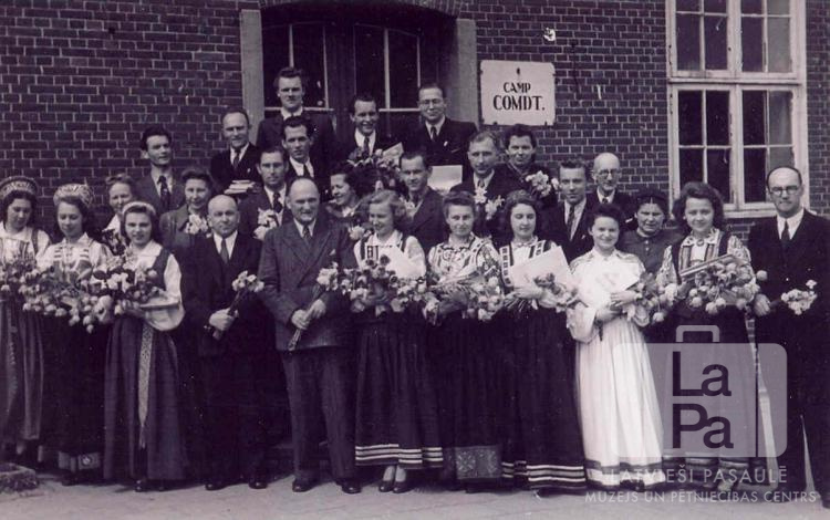 Kārļa Skalbes ģimnāzijas 1949. gada absolventu klase un ģimnāzijas skolotāji ēkas priekšā Sengvardenes nometnē (angļu zonā). Uz ēkas uzraksts: "Camp Comdt." Pirmajā rindā, no kreisās: Biruta Ķīse, Aina Tauriņa (pr. Caune), Zinaida Strode, skolotājs L. Bluķis, klases audzinātājs N. Vīksniņš, Skaidrīte Karpa, Biruta Hermane, Edīte Blūmentāle, Dagmāra Kuniķe, Mārīte Briede un prāvests A. Veinbergs. Otrajā rindā, no kreisās (skolotāji): nezināms, R. Freudenfelde, (?). Jurēvics, M. Michelsone, R. Dzirnis, V. Birzneks, absolvents Sigurds Vījdzirkste un skolotājs O. Grauze (?). Trešā rindā nezināms, Augusts Krievāns, Adrejs Laiviņš, nezināms, nezināms, nezināms. Pēdējā rindā: Kārlis Grauze, Jānis Vanka un Vilnis Vīksne.
