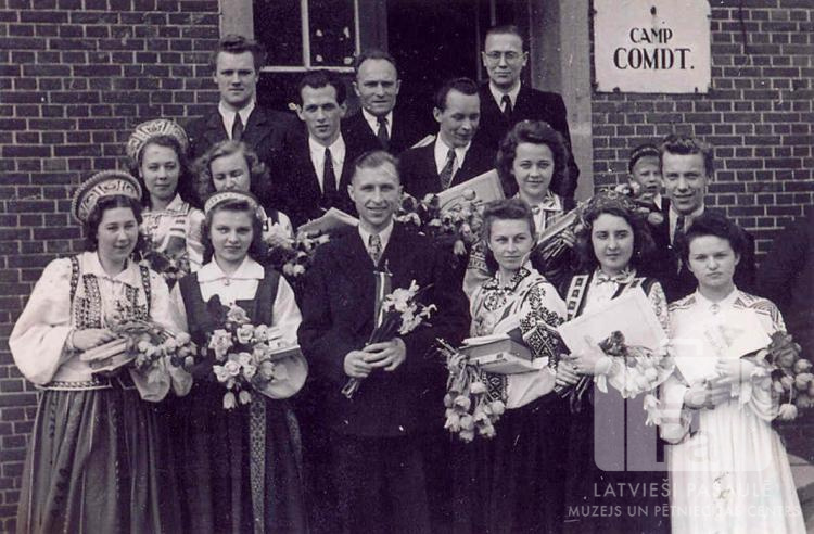 Kārļa Skalbes ģimnāzijas 1949. gada absolventu klase un ģimnāzijas skolotāji ēkas priekšā Sengvardenes nometnē (angļu zonā). Uz ēkas uzraksts: "Camp Comdt." Pirmajā rindā, no kreisās: Biruta Ķīse, Zinaīda Strode, skolotājs/klases audzinātājs V. Birznieks, Biruta Hermane, Edīte Blūmentāle un Dagmāra Kuniķe. Otrajā rindā, no kreisās: Aina Tauriņa (pr. Caune), Skaidrīte Karpa, Andrejs Laiviņš, Jānis Vanka, Mārīte Briede un Sigurds Vidzirkste. Trešajā rindā: Kārlis Grauze, Augusts Krievāns un Vilnis Vīksne.