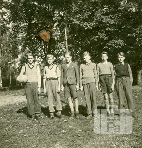 Pamatskolas volejbola spēlētāji Baireitas nometnē (amerikāņu zonā) 1945. gada vasarā. No kreisās: Igors Močalkins, Gundars Ķikauka, Juris Delle, Aivars Kalējs, Gunārs Postnieks un ?. Kristens.