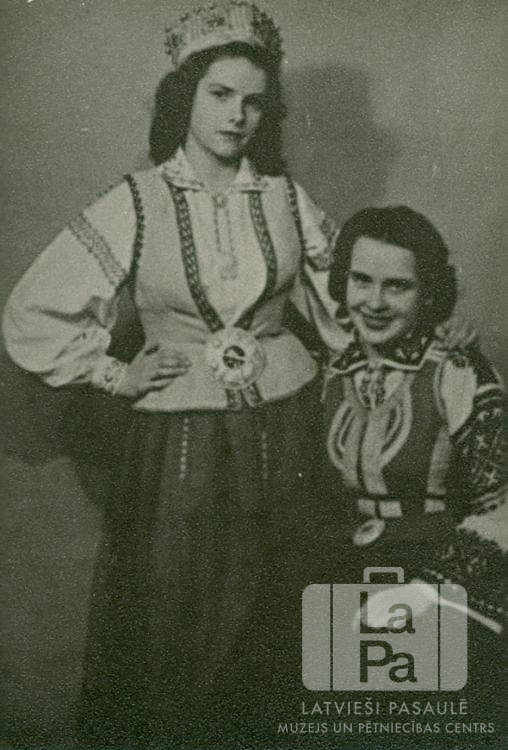 Māsas Ķiploks tautas tērpos Hersbrukas nometnē (amerikāņu zonā) 1947.–1948. mācību gadā. No kreisās: Maija un Vija Ķiploks.