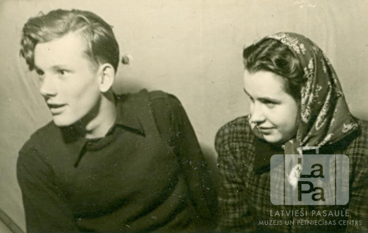 Divi ģimnāzisti Hersbrukas nometnē (amerikāņu zonā) 1947.–1948. mācību gadā. No kreisās: Aivars Kalējs un Vija Ķiploks.