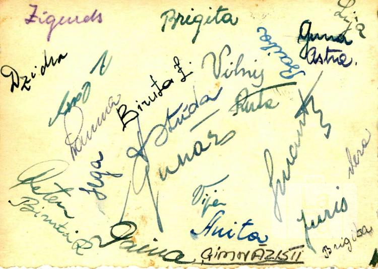 Ģimnāzistu vārdu saraksts Hersbrukas nometnē (amerikāņu zonā) 1947.–1948. mācību gadā. No kreisās (no augšējā kreisā stūra uz leju): Zigurds, Brigita, Lija, Guna, Astra, Dzintra, nesalasāms, Lauma, Biruta Z., Astrīda, Vilnis, Ruta, Baiba, nesalasāms, Biruta R., Ilga, Gunārs, Daina, Vija, Anita, Imants, Vera, juris, Brigita. Apakšā pasvītrots: "Ģimnāzisti".