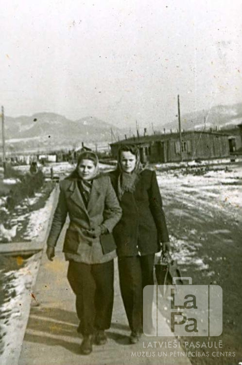 Divas jaunietes Hersbrukas nometnē (amerikāņu zonā) 1947.–1948. mācību gadā. Fonā nometnes barakas un kalni. Par šo gadījumu Aivars Kalējs atceras: "Baireitas "Camp Mack” DP nometnē nebija ģimnāzijas. Jauniešiem, kuŗi vēlējās mācīties latviešu ģimnāzijā, bija jābrauc uz Hersbrukas DP nometnes ģimnāziju un jādzīvo vairākiem skolniekiem vienā istabā. Es dzīvoju kopā ar Juri Delli un Ojāru Kļaviņu."