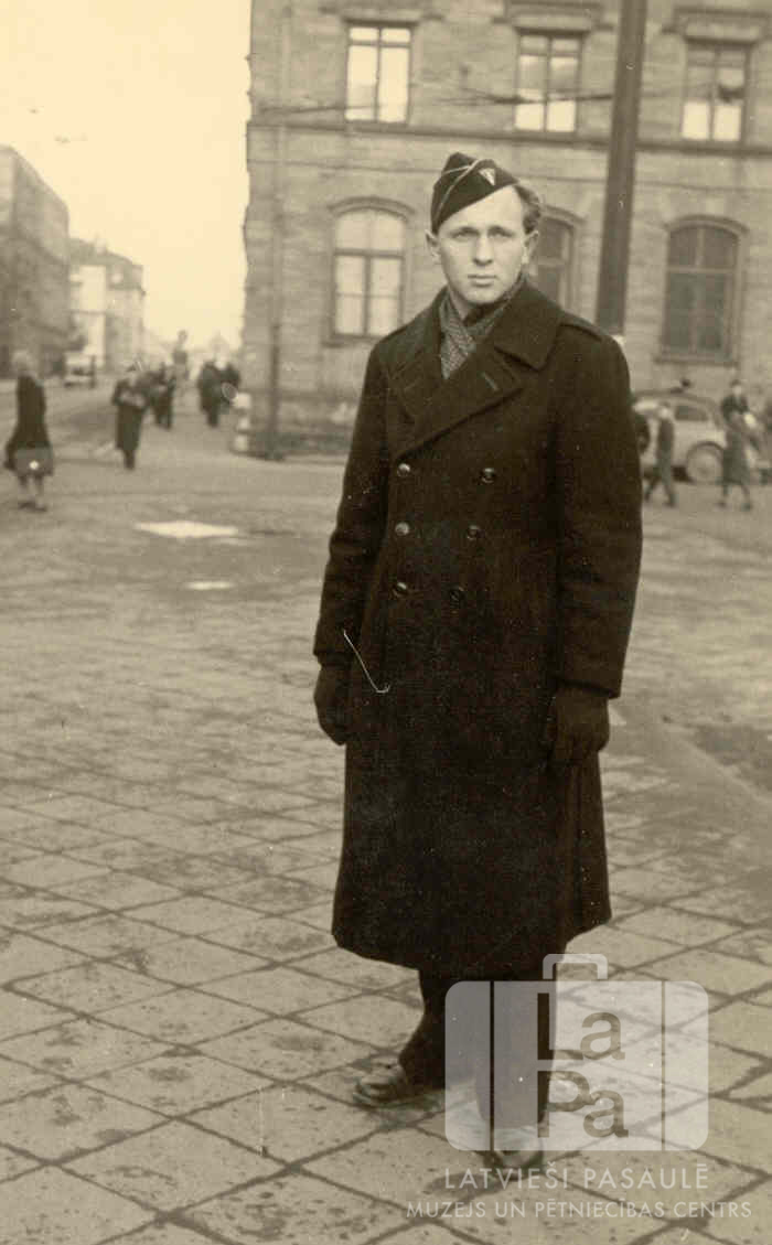 Alfrēds Ūdenāns tumšā, garā formas tērpā, gaidot vilcienu laukumā pie Gisenes stacijas (amerikāņu zonā).