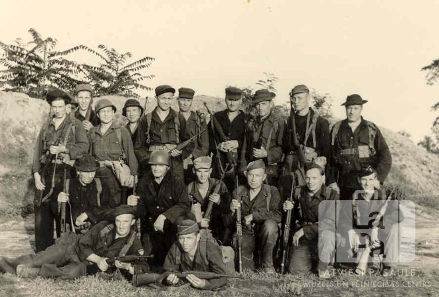 Karavīru grupa ar šautenēm 8850. latviešu inženieru rotas šaušanas apmācībās Hānavas pilsētas apkārtnē (amerikāņu zonā) 1951. gada pavasarī. Otrajā rindā otrais no kreisās (ar ķiveri) – rotas komandieris, Latvijas armijas pulkvedis Saulītis.